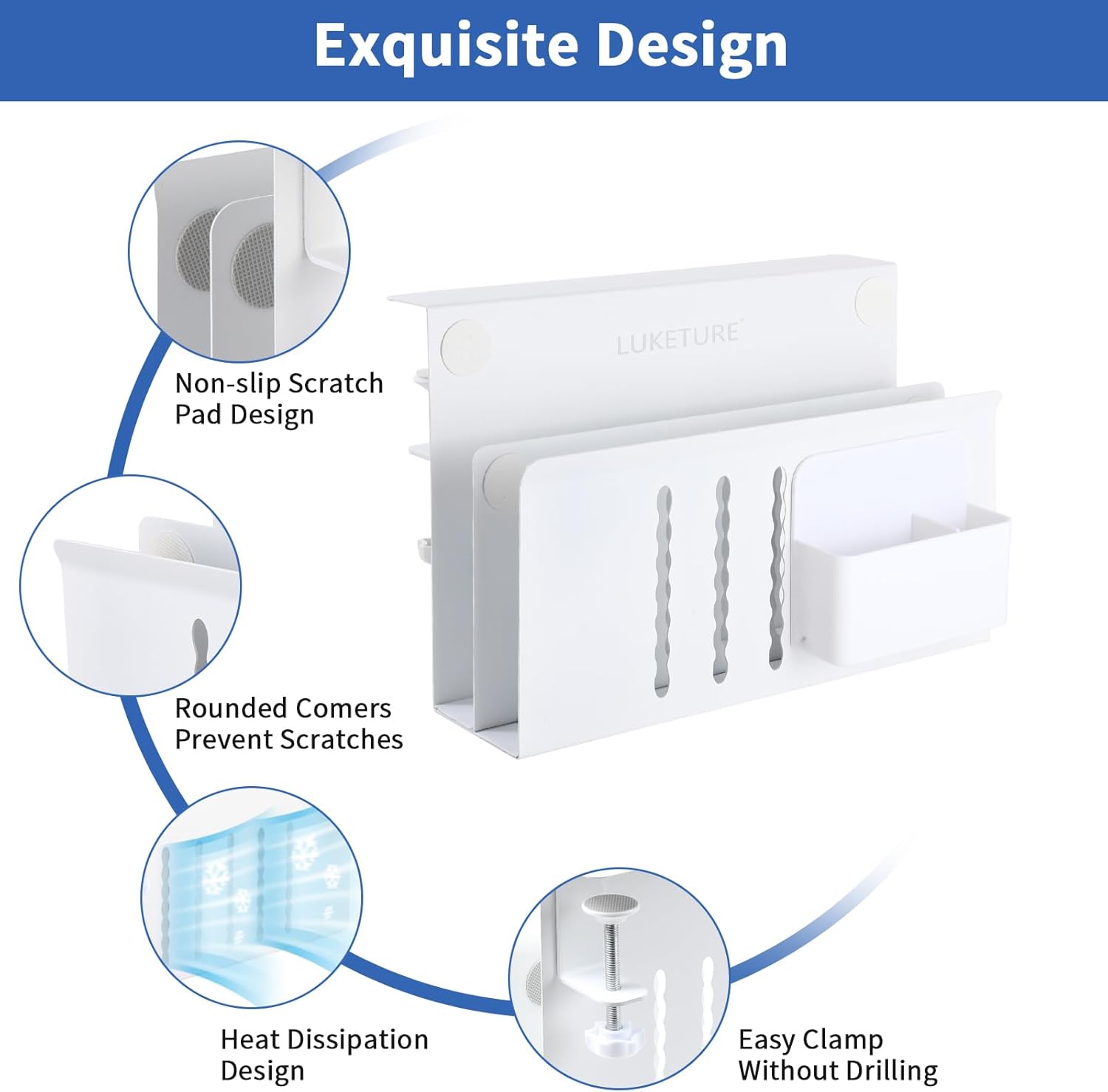 - Multifunctional Desk Side Storage & Anti -Slip And Anti -Scratch Design: This laptop holder can be retrofitted to the side of a desk to easily hold a laptop, tablet, hidden wires, interior accessories, manuals, documents, notebooks, school supplies and other items. On the inner surface of our standing desk side storage, the bottom and ends of the clamp have a non-slip sheet, which can help secure laptop in desk side hanging storage to avoid scratching desktop laptops, tablets or other devices