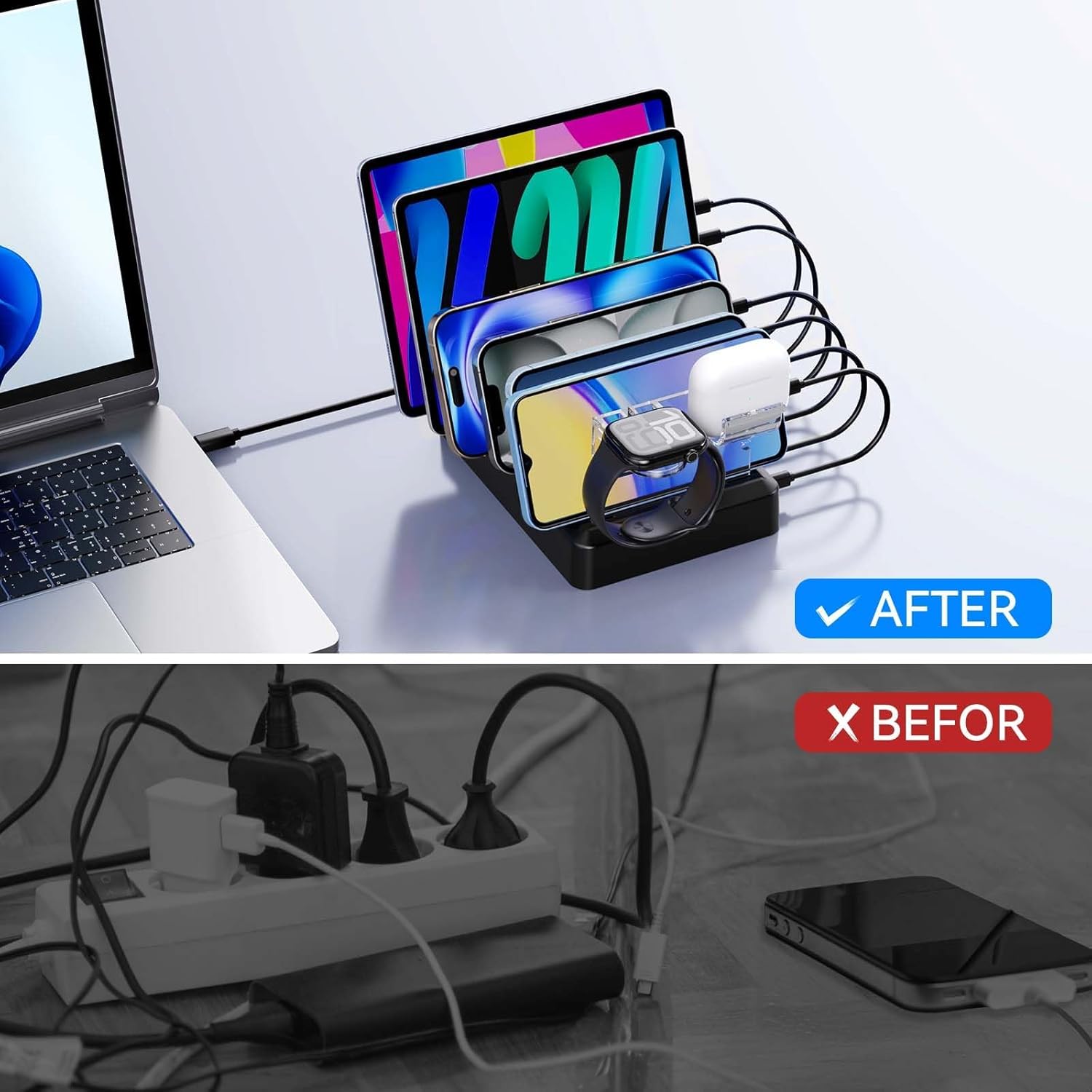 - 【7 in 1 Charging Stations】: 6 ports Charging Station designed with and With the new holder for iWatch Charger & Air-pods (PLEASE NOTE: the Watch charger is not included) conveniently store and charge for any 6 devices combination. With one 6-port USB charger station, No more cluttered cables & and no need to plug a bunch of wall chargers into your power outlet, it keeps your table nice and clean. and frees up outlets in your home and office