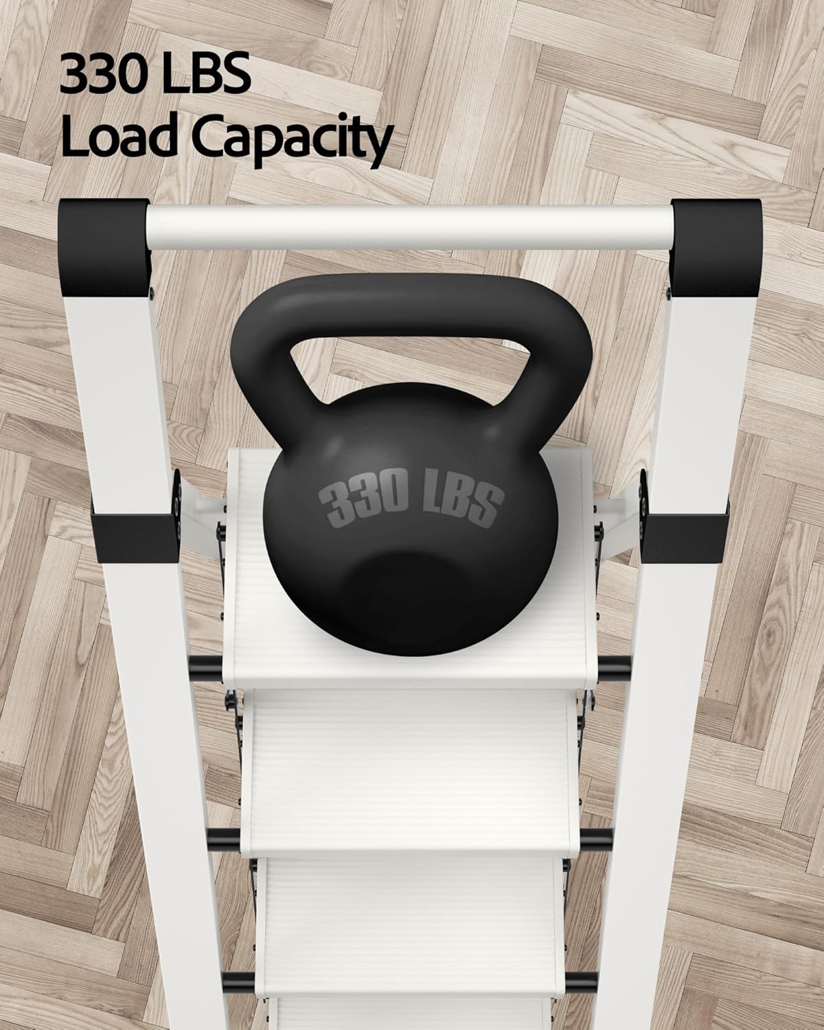 Taranta 4 Step Ladder, Lightweight Aluminum Step Stool with Convenient Handgrip, Folding Ladder with Anti-Slip Pedals, 330lbs Capacity Stepladder for Home, Office, Kitchen - White