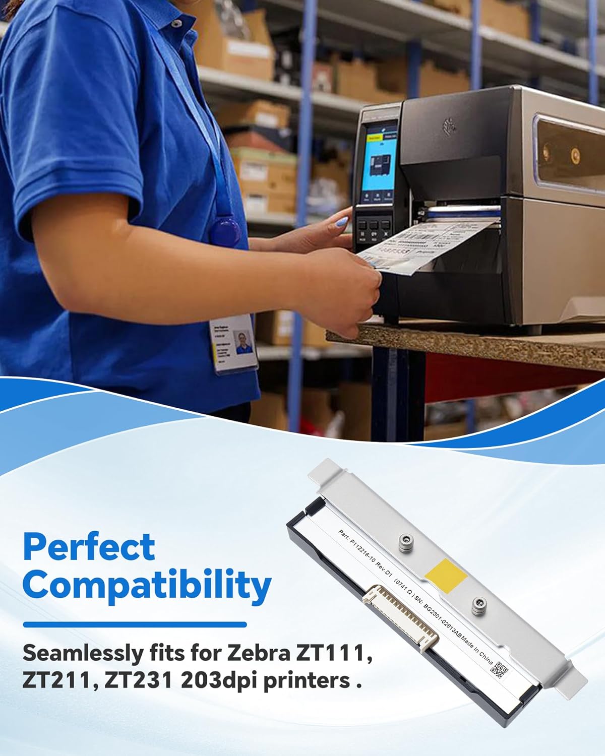 - ăHigh Resolution Printingă: A genuine component of the Zebra ZT111 ZT211 ZT231 203dpi printers (not fit for 300DPI printers), it prints barcodes, text, graphics and other content in crisp, clear 203 dpi high resolution, improving the clarity and readability of each print