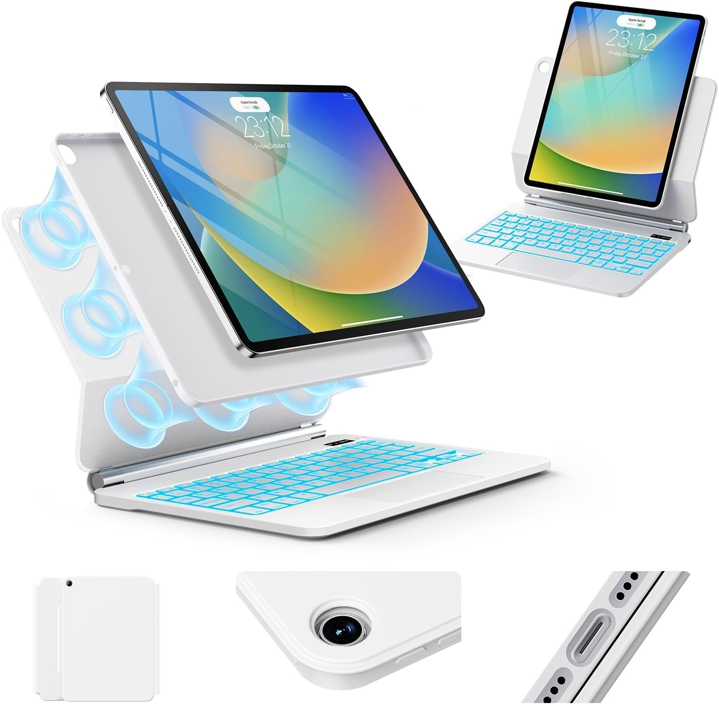 - Floating Cantilever Stand & Multi-View Flexibility: The magic-style floating cantilever stand and strong magnetic attraction hold iPad firmly and stably in place like a laptop, the floating cantilever design allows you to easily adjust to your favorite viewing angle for typing or browsing.