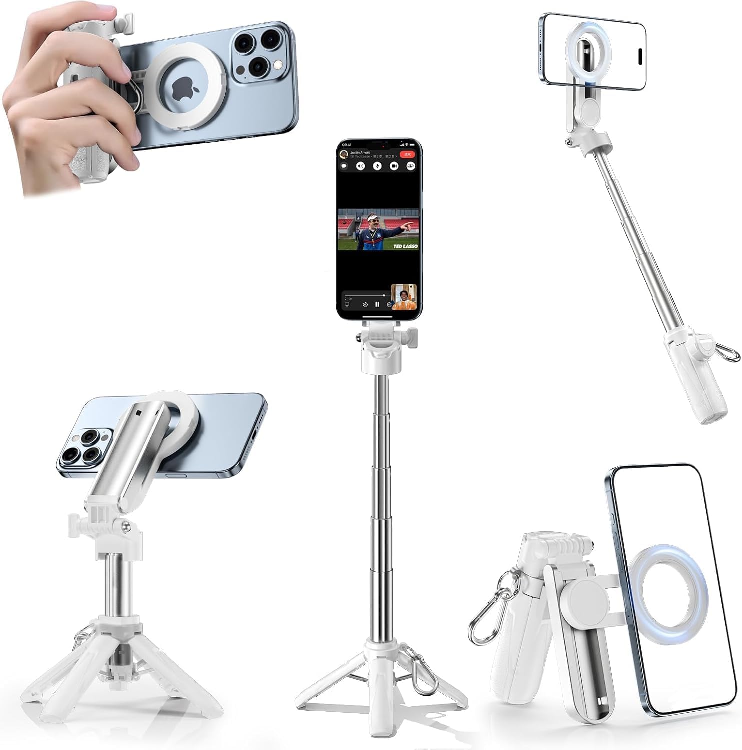 CloudValley Magnetic 4-in-1 Multifunctional Selfie Stick Tripod, Mini Portable Pocket Phone Stand with Detachable Remote, Compatible with MagSafe, for iPhone/Android, Travel Vlog, Live Stream, White