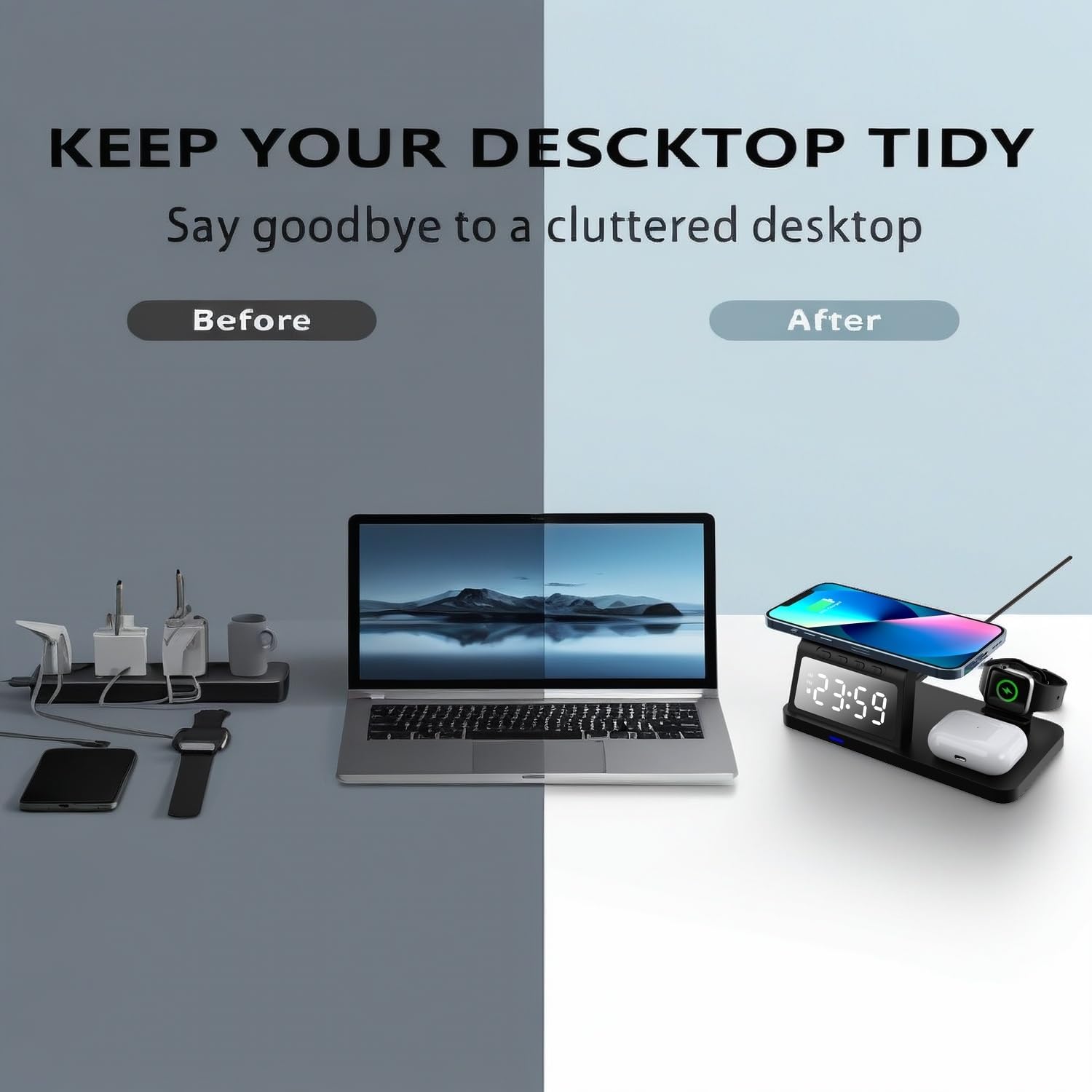 4-in-1 Wireless Charging Station with Clock Display, Compatible with iPhone, Apple Watch, AirPods, Black