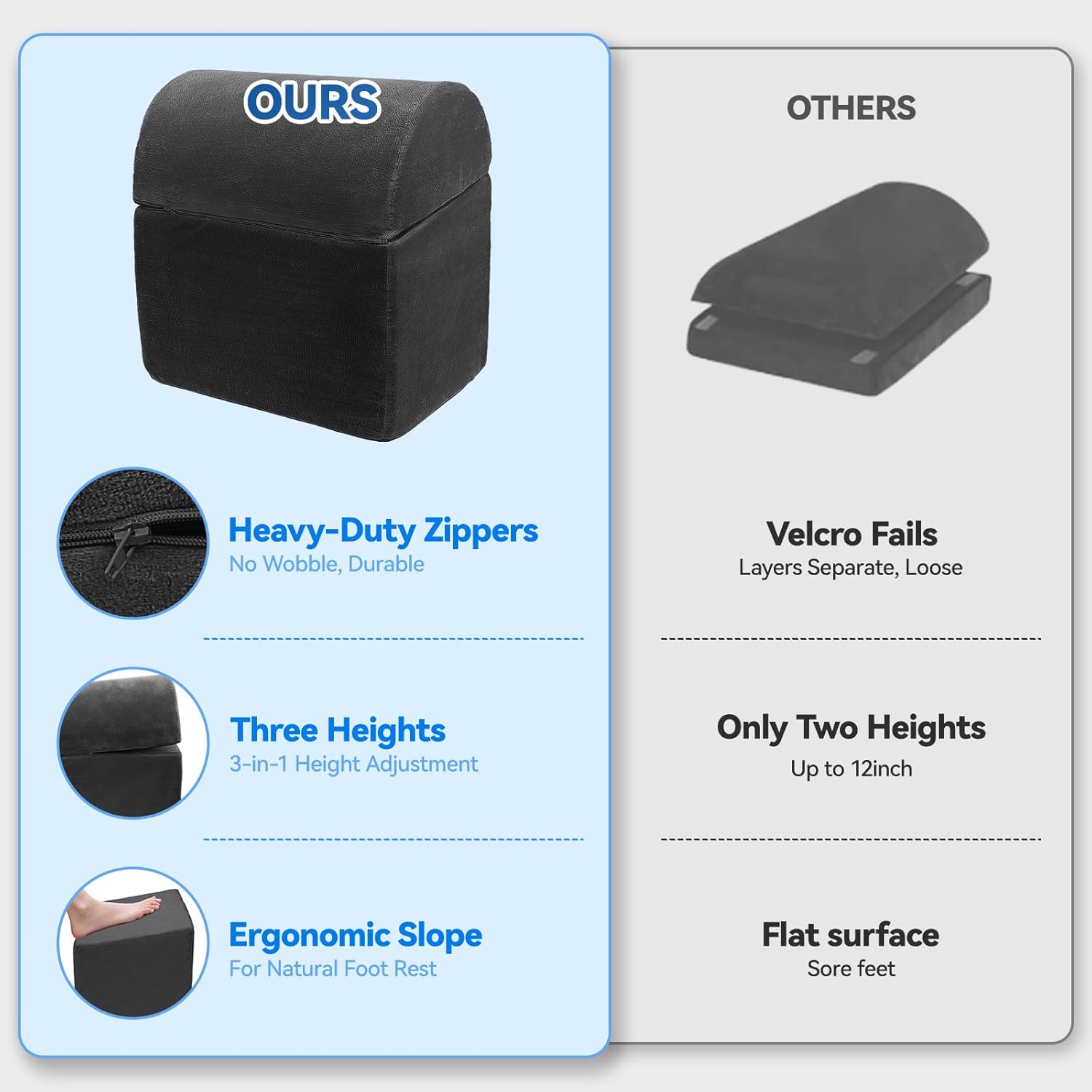 - [STABLE & COMFORTABLE] Unlike footrests with Velcro connections, ours features heavy-duty dual zippers to keep layers securely connected, while a double-layer non-slip bottom prevents sliding on any surface, making it a reliable foot rest for under desk in offices or home setups.