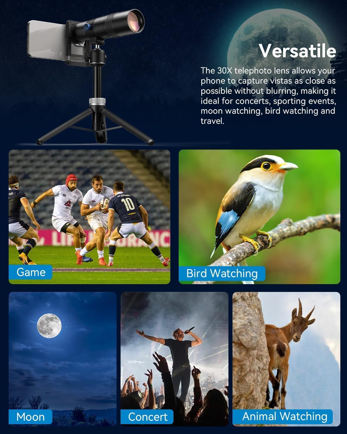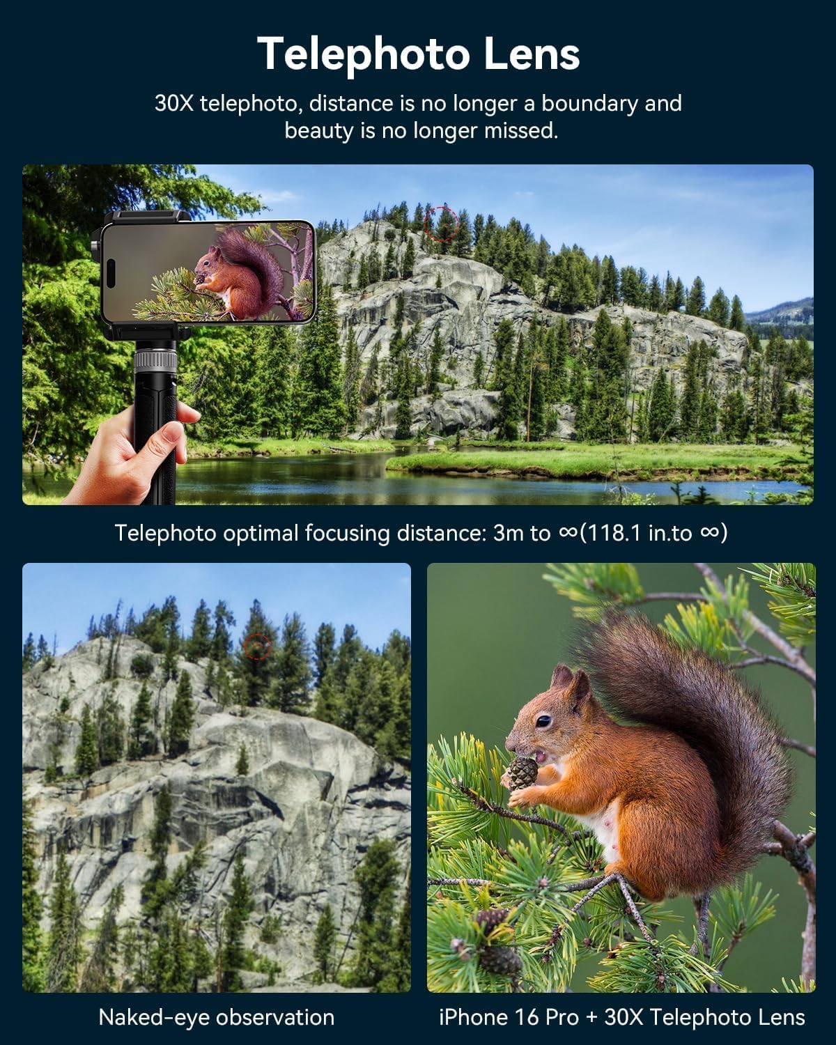 - Metal Material & 4K HD Lens: The 30X telephoto lens is made of aluminum alloy and equipped with high-quality glass lenses. It's durable and clear. This powerful lens can capture the finest details and the most accurate colors, enhancing image clarity and sharpness, allowing your phone to take long-distance shots without compromising image quality