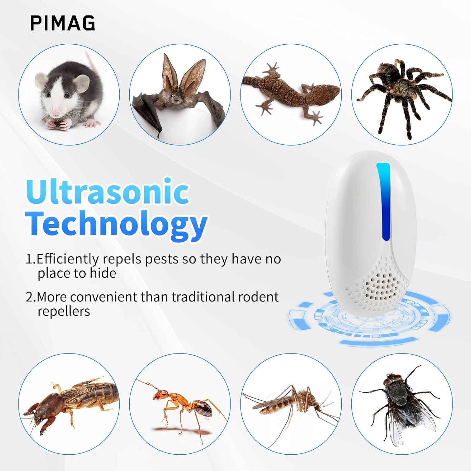 - [Ultrasonic Technology] The plug-in indoor pest control uses ultrasonic waves to stimulate the brain and auditory nervous system of pests, effectively repelling a variety of pests, including fleas, cockroaches, mice, insects, mosquitoes, ants, spiders, bed bugs, etc. The intelligent multi-frequency ultrasonic conversion system leaves pests nowhere to hide.