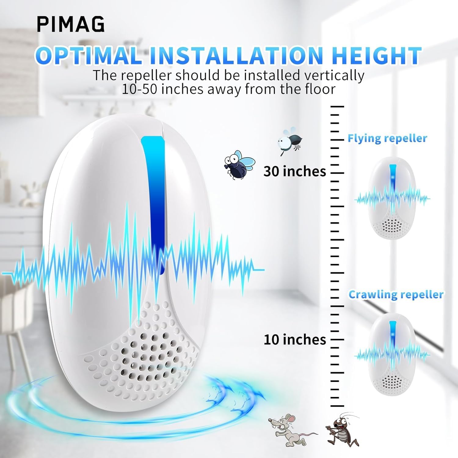 - [Wide Effective Coverage] The indoor pest control is suitable for 1600 square feet and can be used in various places such as bedrooms, garages, kitchens, offices, warehouses, attics, barns, etc. Install one vertically in each room, 10-50 inches from the floor to repel mice in the walls. We recommend installing more repellents in areas with severe pests. In 2-3 weeks, you will notice a significant reduction in pest activity.
