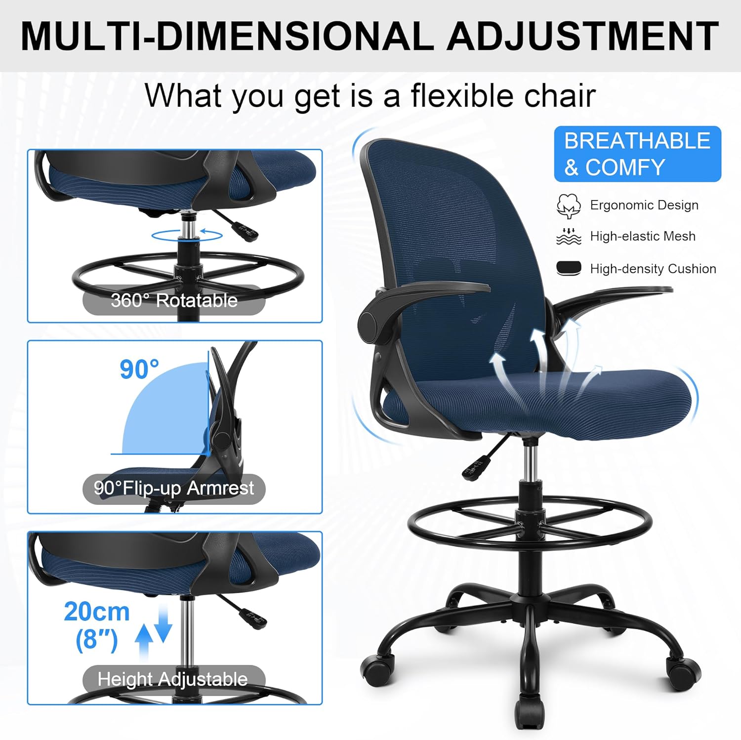 Drafting Chair, Tall Office Chair Ergonomic Standing Desk Chair,with Adjustable Footrest Ring, 3D Lumbar Support, Flip-up Armrests, Swivel Desk Stool for Drawing Working Navy