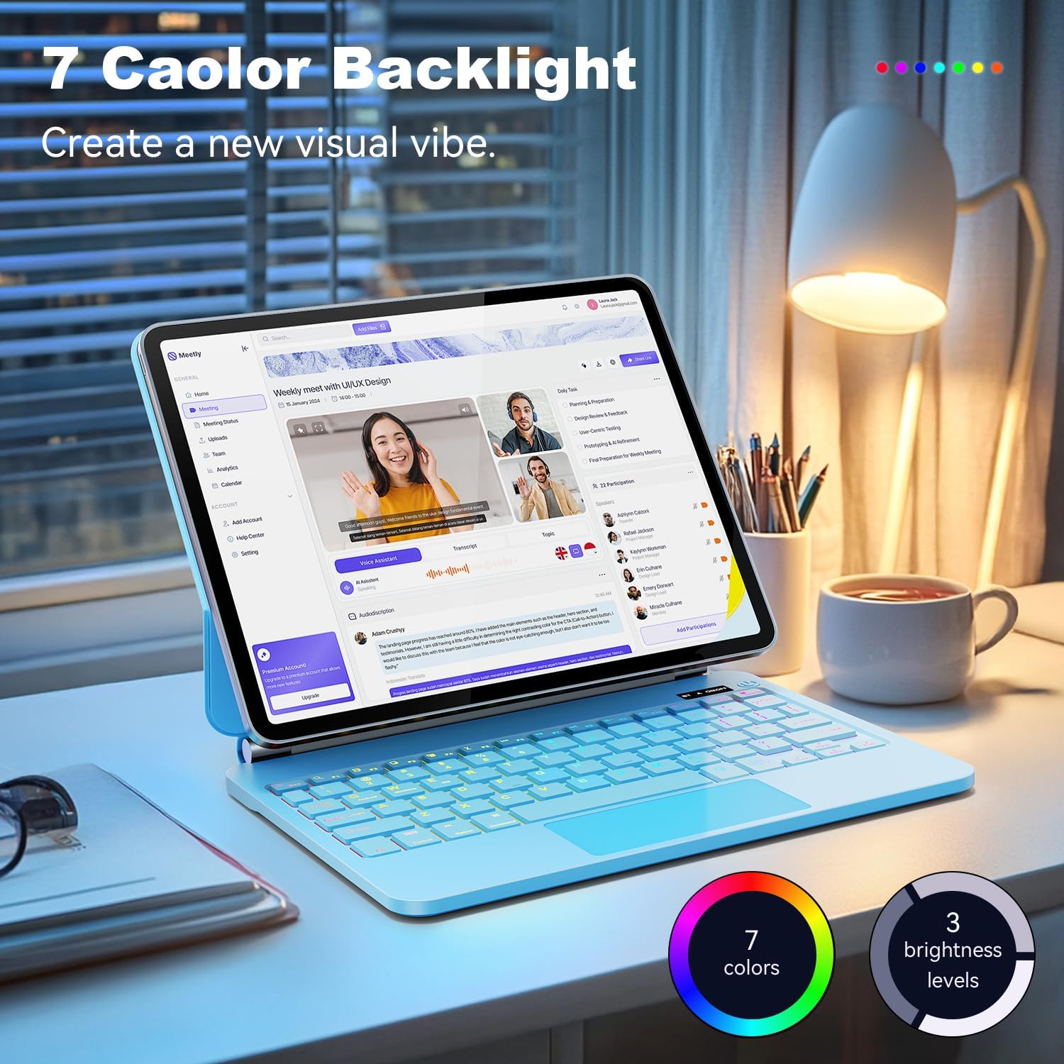 - 7-Color Backlit Keyboard for iPad Air inch (M2) 2024:From dawn to dusk, adapt effortlessly! Adjusting 7 backlight and 3 levels of brightness ensures clear visuals in every setting, enhancing your immersive experience