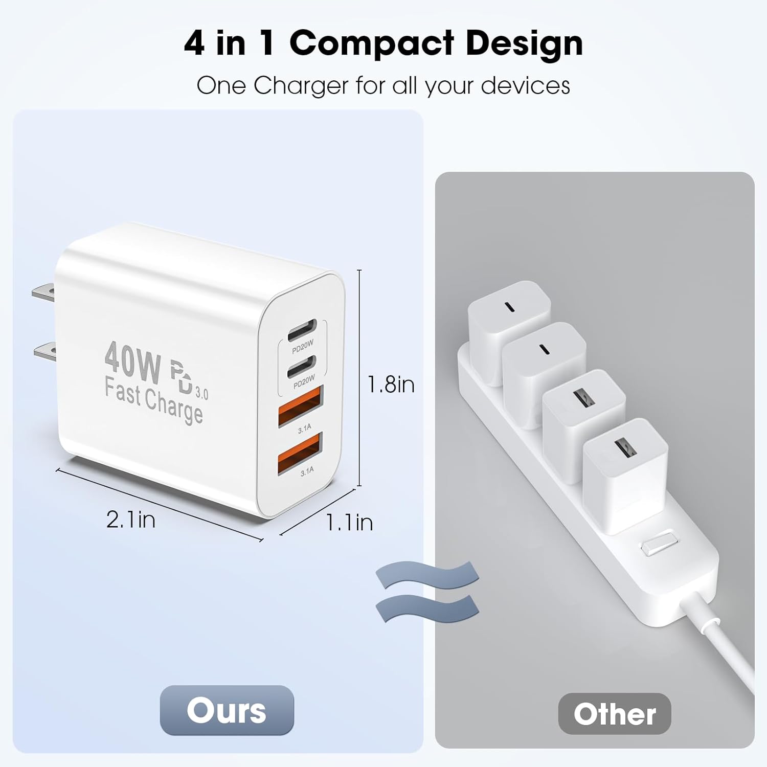 - 【USB C Charger Block 】 This USB C wall charger delivers true fast charging block performance with 40W PD3.0 (USB-C) + 40W QC4.0 (USB-A). Charges your iPhone 16/15 Pro Max to 60% in just 30 minutes - 3x faster than standard Apple charging blocks.