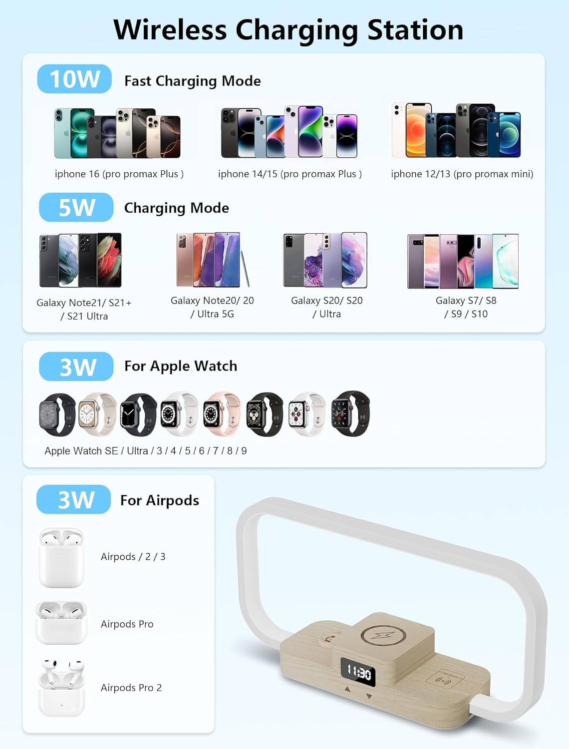 - 【Wireless Charging Compatible Models】 Say goodbye to your messy bedside table caused by too many chargers and cables. Our wireless charger lamp compatible with Phone 17/Phone 17 Air/Phone 16/16 Plus/16 Pro/ 16 Pro Max/Phone 15/15 Plus/15 Pro/ 15 Pro Max iPhone 14/14 Plus/14 Pro/ 14 Pro Max/13/13 Pro/13 Pro Max/13 mini/12/12 Pro Max/12 mini/11/11 Pro Max/SE 2020/XS MAX/XS/XR/X/8/8 plus. Galaxy S22 /S21/S20/Note 10/S10 and other phones support wireless charging function; Apple Watch 7/6/5/4/3/2/SE. Airpods Pro/3/2.