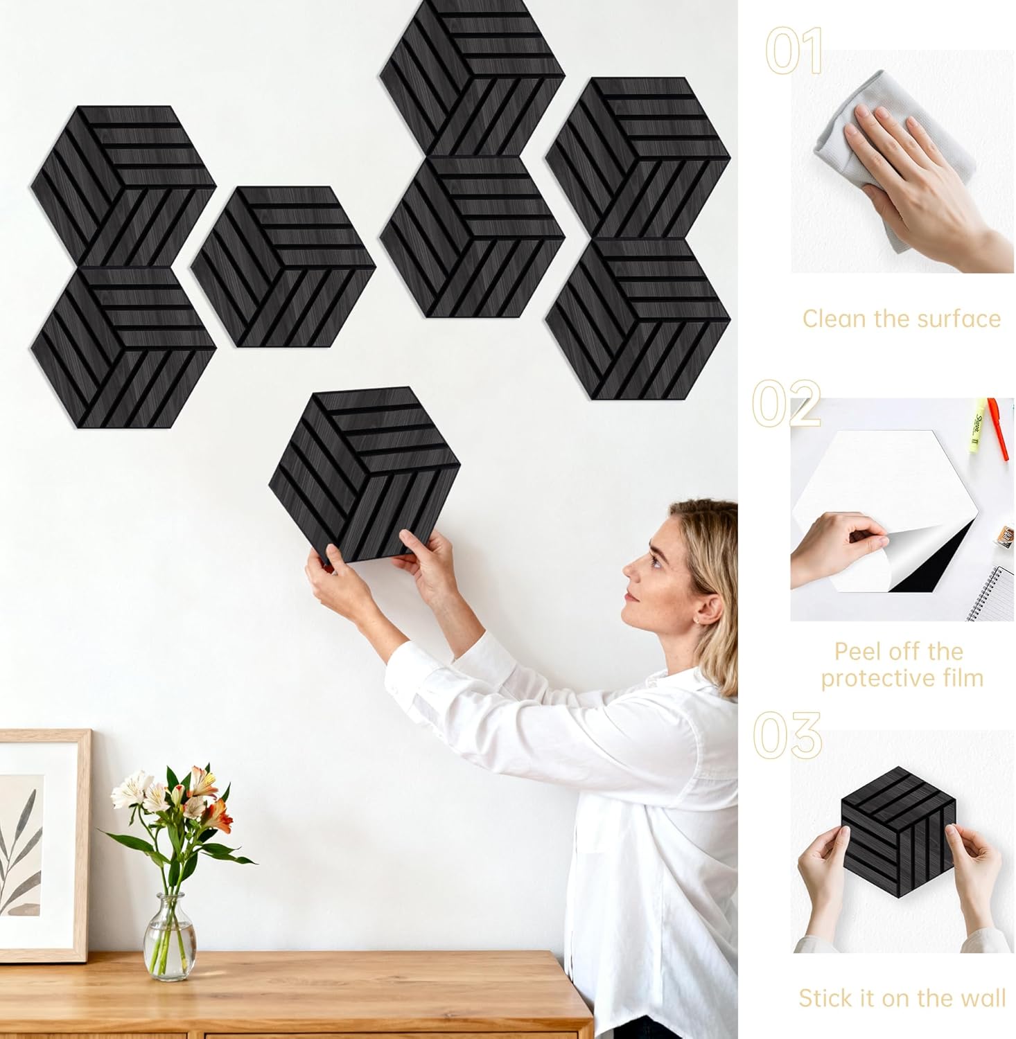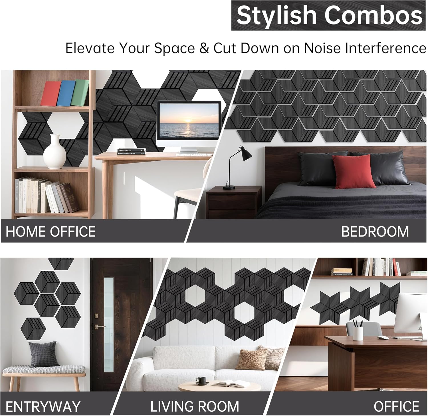 Mollywell Hexagon Acoustic Panels, Black Oak TH4, 14x12x0.4 Inch, 12 Pack |Wood Veneer|High Density Sound Proofing Wall Panels|Self Adhesive Sound Dampening Felt Wall Tiles|Home Theater|Gaming Room|