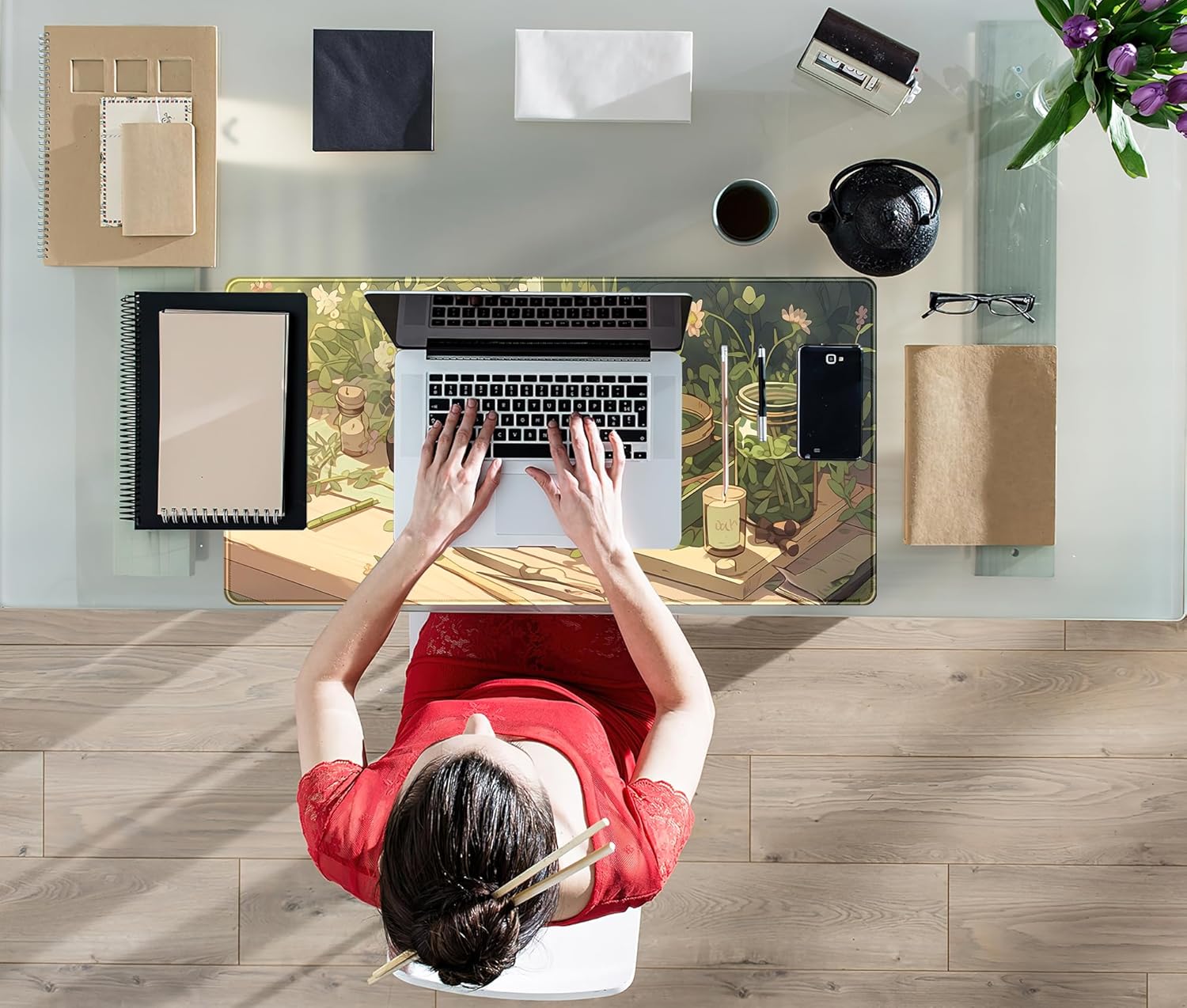 Cute Desk Mat Green Sage Mouse Pad Anime Forest XXL Large Extended Gaming Mousepad Desk Matt for Desktop Computer Pad Mat, Laptop Keyboard Mouse Mat Office Decor Accessories for Women, 31.5x15.7 in