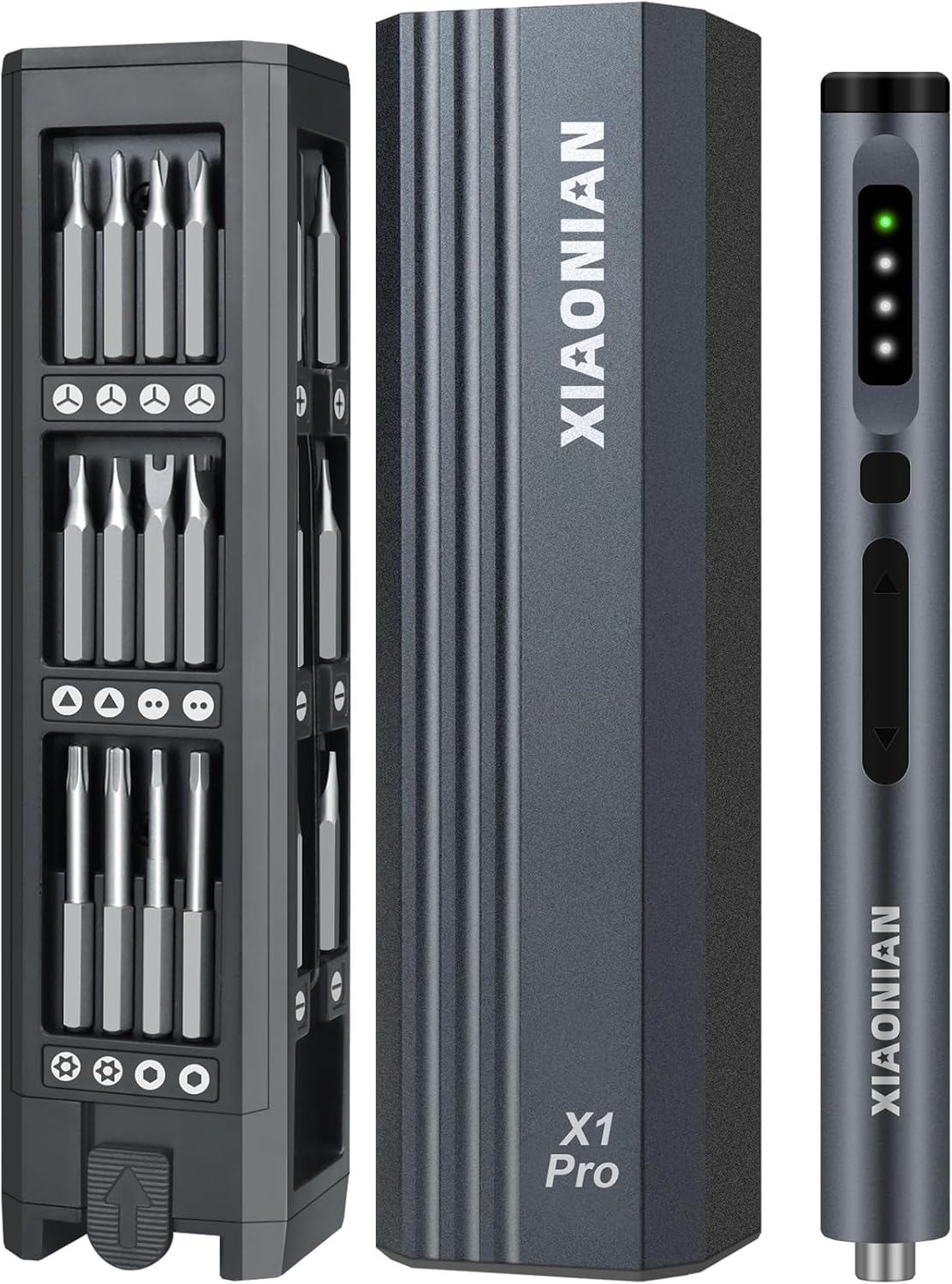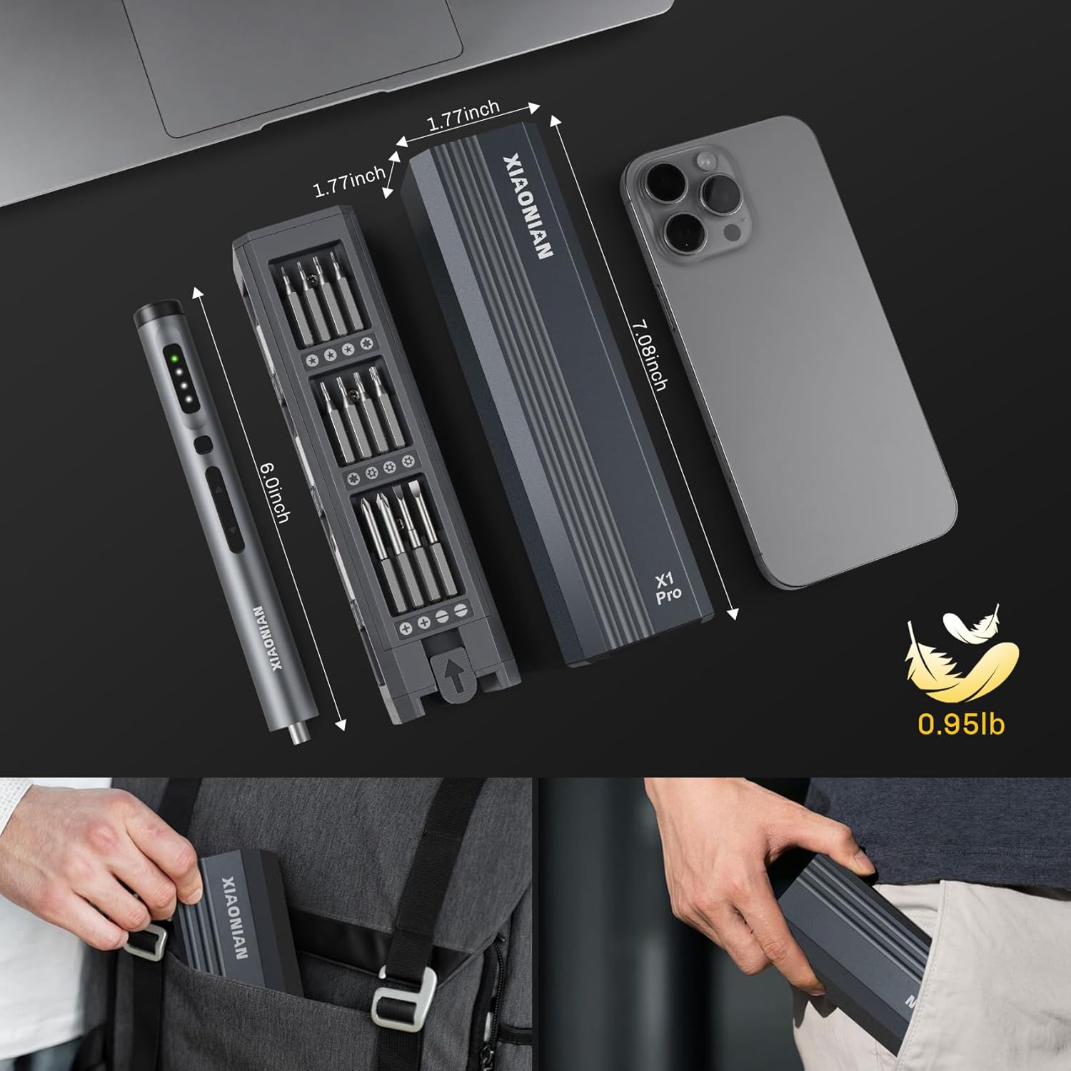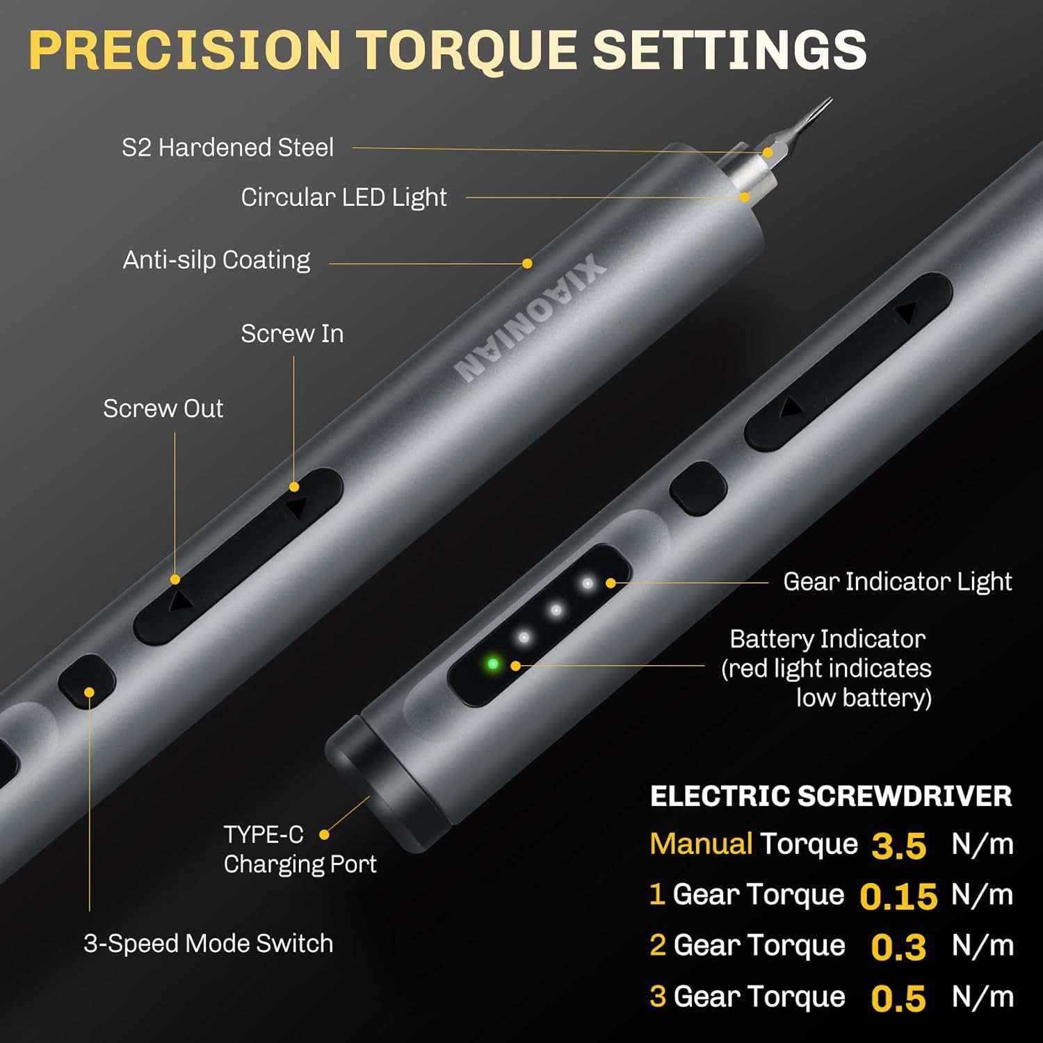 - Precision Adjustable Torque:This Electric Screwdriver Set features 3 adjustable torque settings–With 3 electric gears plus a manual mode,electric torque range of 0.15 to 0.5N.m and a manual torque of 3.5N.m.The precise torque control makes the mini electric screwdriver set for repairing a variety of delicate electronic devices with accuracy.You get pinpoint control whether you're cracking open a laptop,assembling a drone, or tightening door hinges.