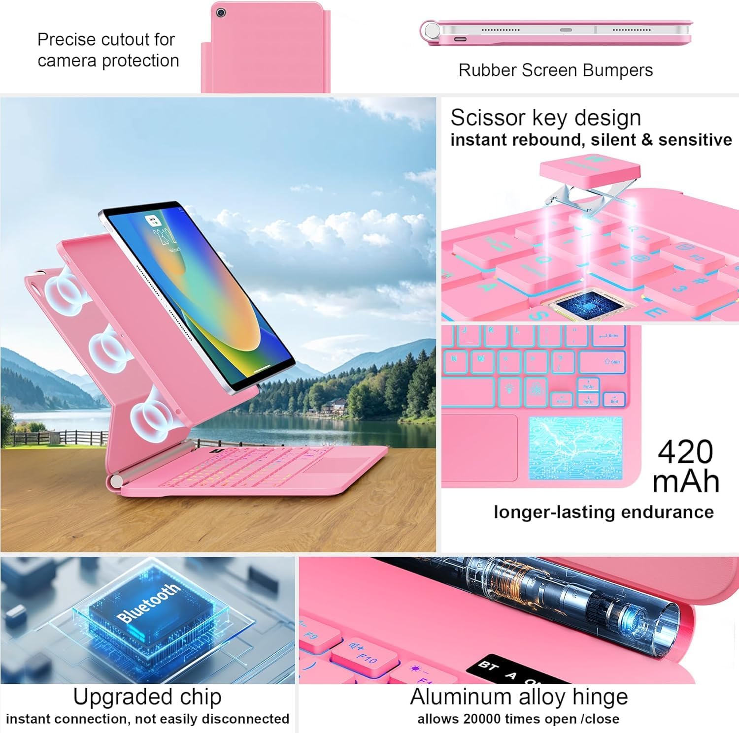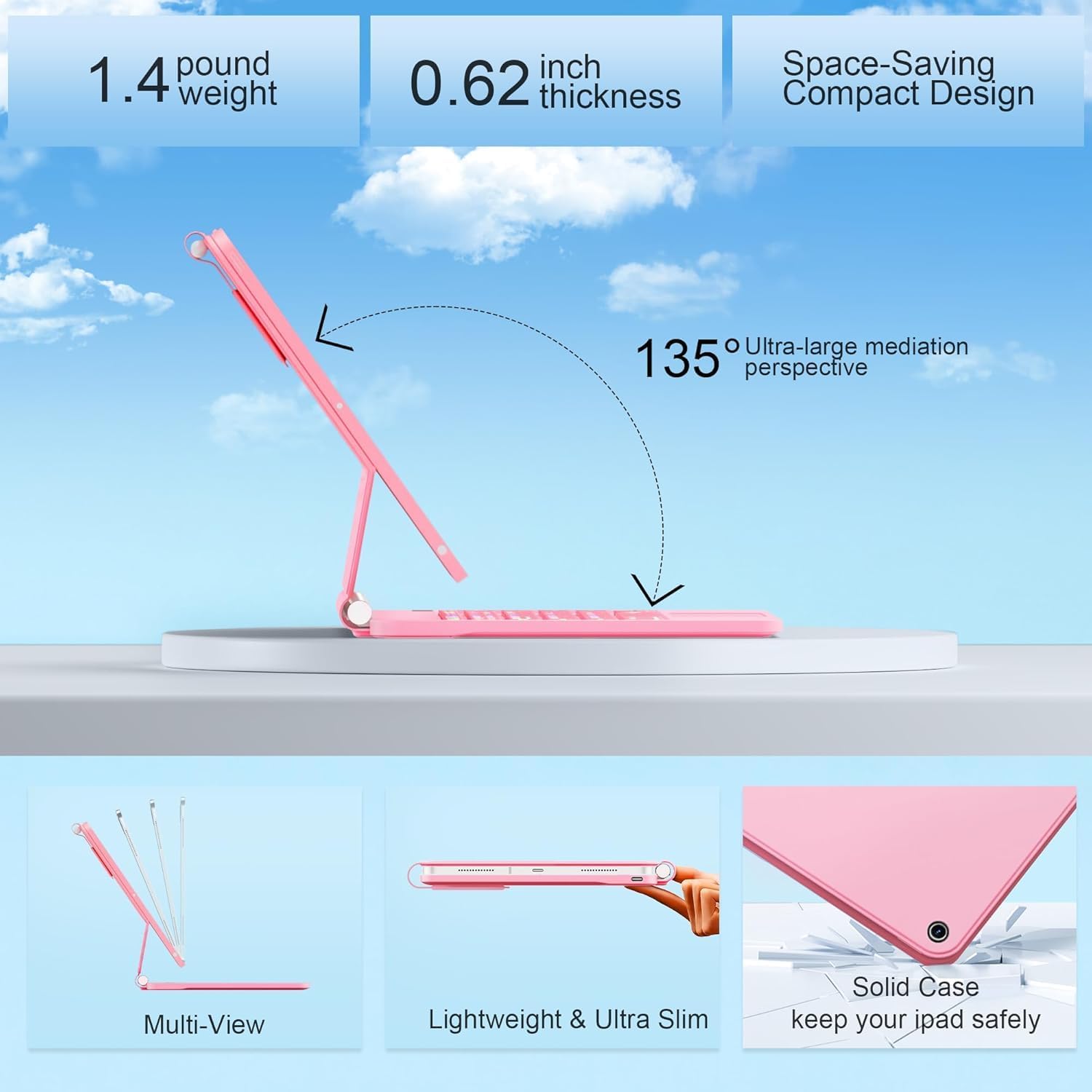 - Floating Cantilever Stand & Multi-View Flexibility: The magic-style floating cantilever stand and strong magnetic attraction hold iPad firmly and stably in place like a laptop, the floating cantilever design allows you to easily adjust to your favorite viewing angle for typing or browsing.