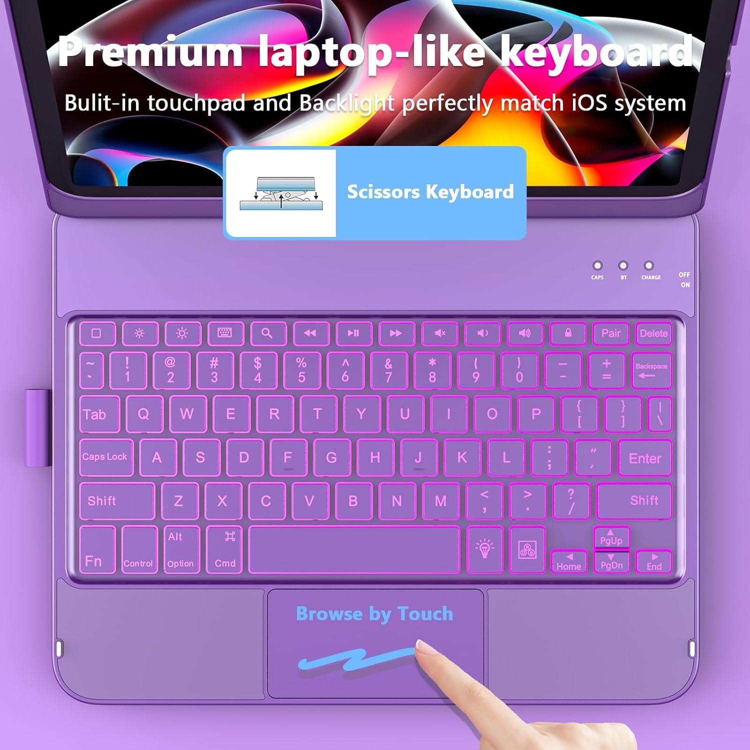 for iPad A16 11th Generation/10th Generation Case with Keyboard,Touch Keyboard for iPad 11" /10th Gen 10.9 inch 2022-10 Color Backlight, 360° Rotatable Protective Cover (Purple)